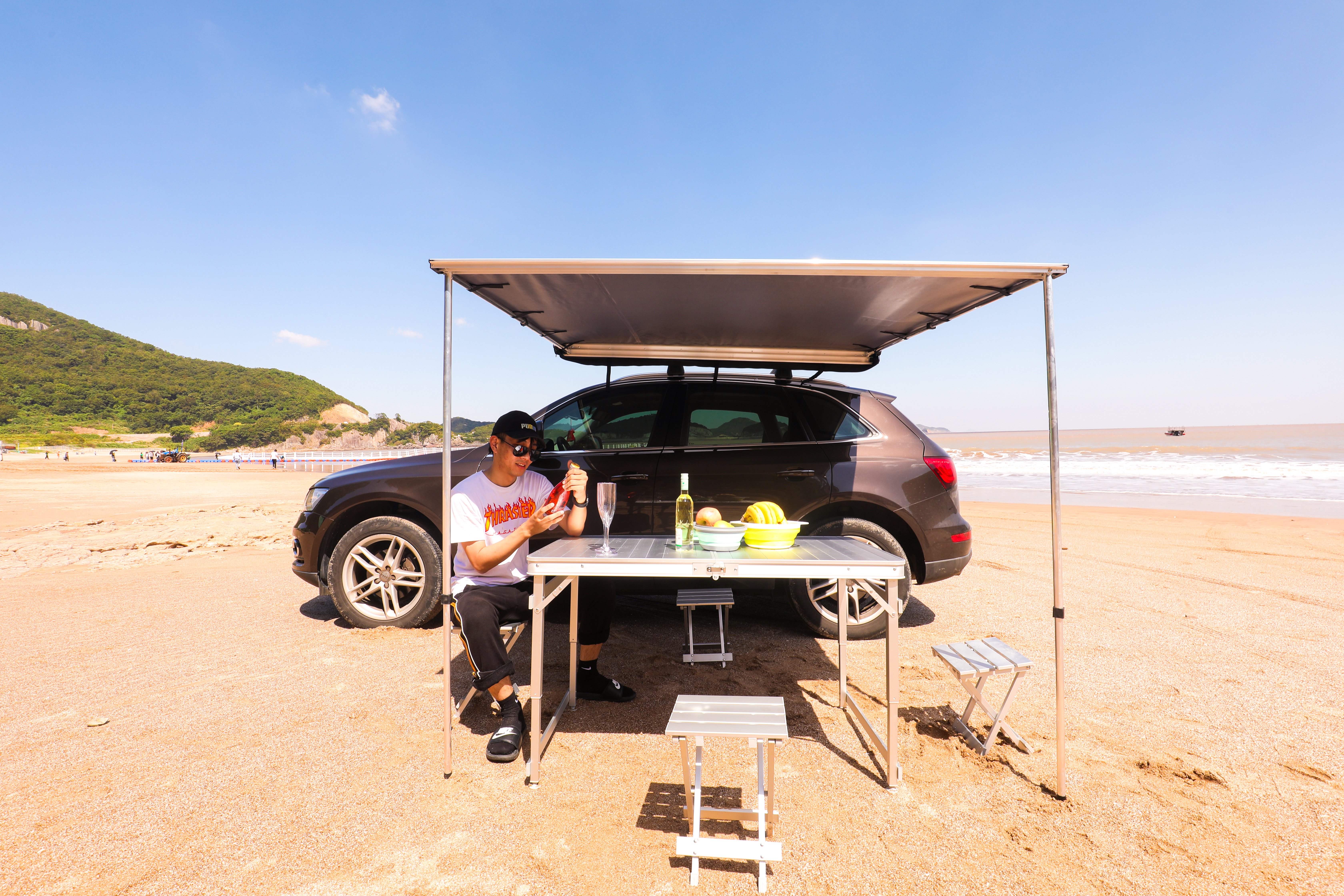 Размер тента в рабочем состоянии: 2,5 метра по длинной стороне (вдоль автомобиля) и 2,5 метра по вылету. Такой тент позволяет с комфортом разместить рядом с автомобилем трех-четырех человек.