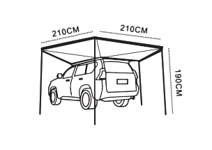 Размер тента в рабочем состоянии: 2 метра по стороне, которая крепится к автомобилю и 2 метра по вылету. Такой тент позволяет с комфортом разместить рядом с автомобилем 4-5 человек.
