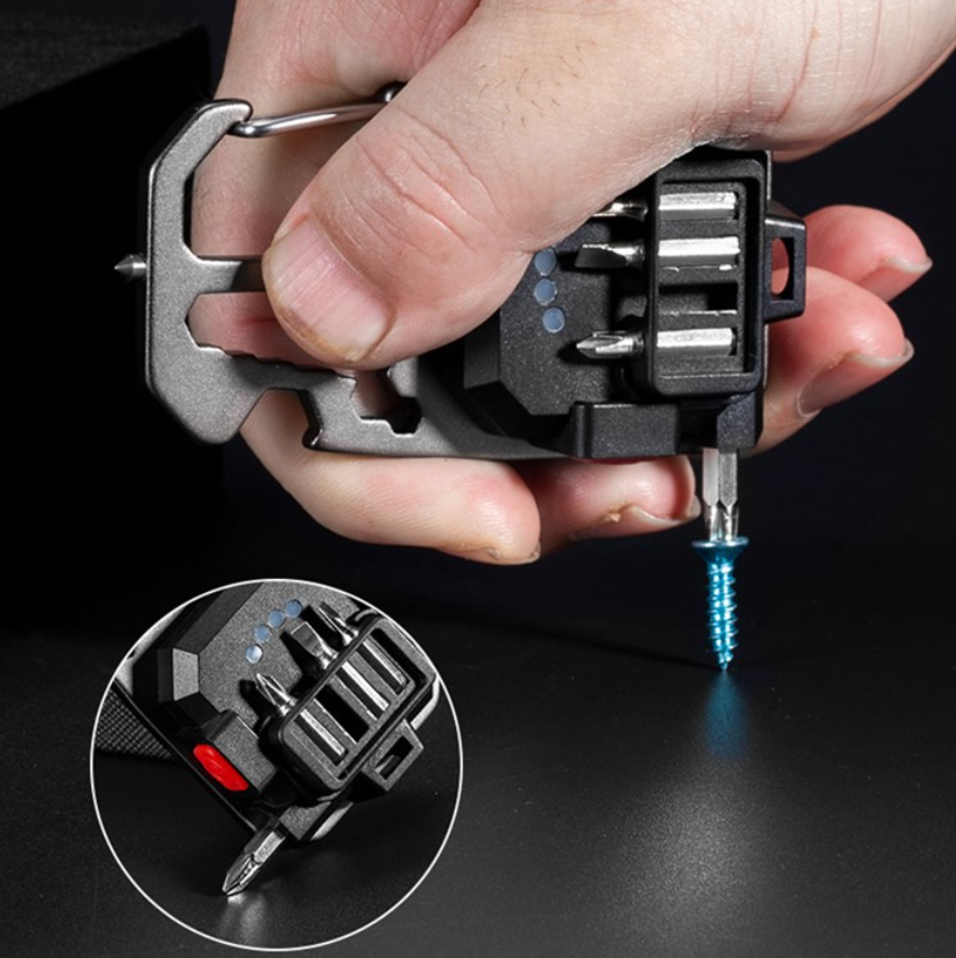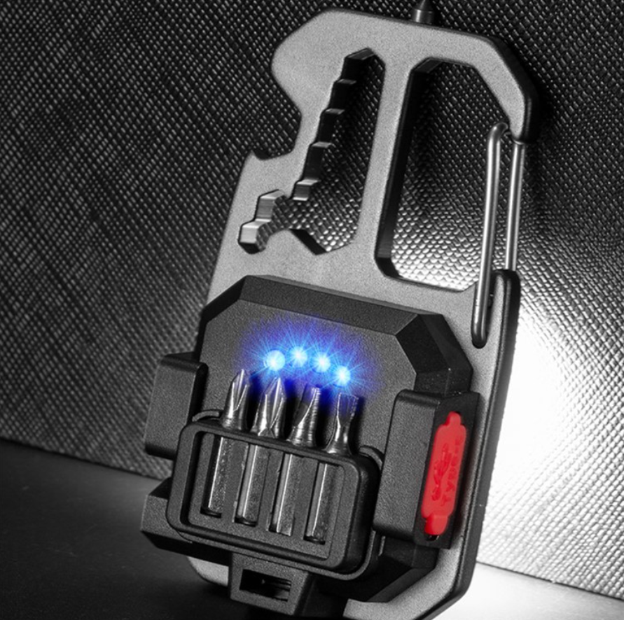 - Комплектация: фонарь, провод для зарядки, коплект из 4 бит, стеклобой, карабин, открывашка, велосипедный ключ